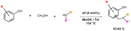 - Mastalir, M.; Pittenauer, E.; Allmaier, G.; Kirchner, K. Manganese-Catalyzed Aminomethylation of Aromatic Compounds with Methanol as a Sustainable C1 Building Block. J. Am. Chem. Soc. 2017, 139, 8812–8815. [Google Scholar] [CrossRef] [PubMed]
