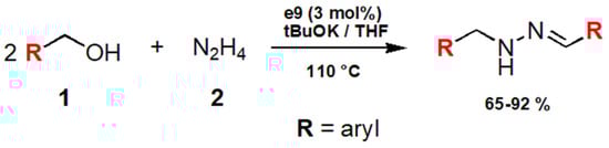 - Das, U.K.; Ben-David, Y.; Diskin-Posner, Y.; Milstein, D. N-Substituted Hydrazones by Manganese-Catalyzed Coupling of Alcohols with Hydrazine: Borrowing Hydrogen and Acceptorless Dehydrogenation in One System. Angew. Chem. 2018, 130, 2201–2204. [Google Scholar] [CrossRef]