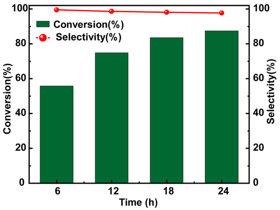 The change in reaction results over time can reflect the change in catalytic reaction rate. Under the optimized experimental conditions mentioned above, we used CS-3 as the catalyst to investigate the effect of reaction time on the epoxidation of 1-octene, which was reacted in methanol solvent for 6, 12, 18, and 24 h. From Figure 4, it can be seen that after 6 h of reaction, the conversion rate of 1-octene is 51.6% and the selectivity of the epoxide is 98.6%. When the reaction time is extended from 6 to 18 h, the conversion rate increases significantly from 51.6% to 85.2%, while the selectivity decreases slightly from 98.6% to 97.6%. With further extension of the time to 24 h, the effect on the epoxidation of 1-octene is not significant. This may be due to the decrease in the concentrations of H2O2 and 1-octene as the reaction progresses, leading to a slower reaction rate.