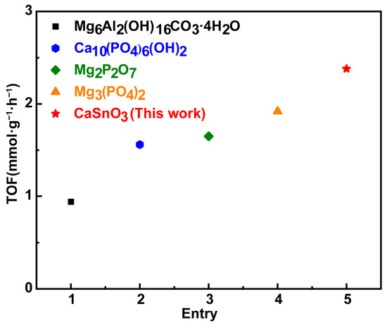 In order to better evaluate the catalytic performance of CaSnO3, we compared it with some catalysts reported in the literature. We quantified the catalytic performance of different catalysts using the production rate of 1,2-epoxyoctane per gram of catalyst per hour as an evaluation indicator. The results (Figure 6) showed that compared to Mg-based solid base catalysts such as hydrotalcite (Mg6Al2(OH)16CO3·4H2O) [34], Mg2P2O7 [35], and Mg3(PO4)2 [36], CaSnO3 exhibits better catalytic performance, with a turnover frequency (TOF) value of 2.38 mmol·g−1·h−1. Furthermore, the catalytic performance of CaSnO3 -s also higher than that of hydroxyapatite Ca10(PO4)6(OH)2 [22], which is another Ca-based catalyst.