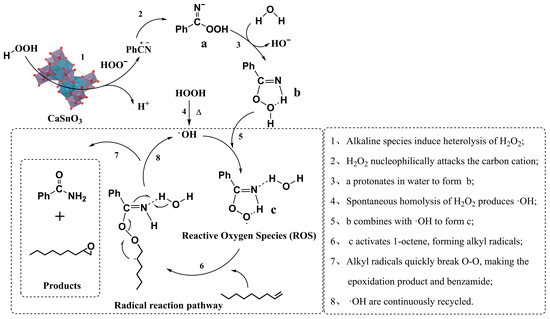 Based on the above experimental phenomena and literature reports [49], we propose a reaction mechanism for the formation of 1,2-epoxyoctane and benzamide from 1-octene catalyzed by CaSnO3, using hydrogen peroxide as an oxidant and benzonitrile as a co-oxidant. The reaction mechanism is illustrated in Scheme 1. Firstly, under the influence of alkaline species on the CaSnO3 catalyst surface, H2O2 undergoes heterolysis to generate HOO− (Step 1). Subsequently, the generated HOO− nucleophilically attacks the carbon ion in benzonitrile, forming intermediate a (Step 2). Intermediate a is protonated in the presence of water, yielding intermediate b (Step 3). Simultaneously, H2O2 undergoes homolysis spontaneously, leading to the generation of hydroxyl radicals. Heating facilitates the homolysis of hydrogen peroxide, thereby accelerating the production of hydroxyl radicals (Step 4). Then, intermediate b combines with the hydroxyl radicals generated through the homolysis of H2O2, forming the crucial intermediate c (Step 5). It is worth noting that H2O2 not only participates in the generation of the target oxidation products but also spontaneously decomposes to produce oxygen and water. Intermediate c forms a five-membered ring through intramolecular hydrogen bonding, which is the active oxygen species in this reaction. Proton solvents, methanol and water, in the reaction system not only effectively promote the charge transfer in proton transfer equilibrium reactions but also stabilize the active intermediate through intermolecular hydrogen bonding. Finally, the active species (intermediate c) activates the double bond of 1-octene, connects with the C-O bond to form alkyl radicals (Step 6), and then rapidly cleaves the O-O bond to produce the epoxidation product. Meanwhile, the remaining part undergoes electron rearrangement to form the byproduct benzamide (Step 7), while the hydroxy radicals are continuously recycled (Step 8).