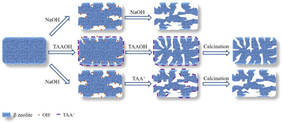 Alkaline desiliconization is the process of alkaline treatment over the synthesized zeolite within the range of 50–80 °C. High-silicon zeolites with a Si/Al ratio greater than 20 usually have better desiliconization effects [58]. The alkaline treatment desiliconization process is usually accompanied by a small amount of aluminum leaching, but the aluminum content on the outer surface of zeolite usually leads to uneven silicon dissolution during alkaline treatment [59]. Currently, alkaline media used in alkali treatment can be divided into strong bases (NaOH, LiOH, KOH, and CsOH) and weak bases (NaHCO3, Na2CO3, and NH3·H2O). Treating with different alkaline substances will lead to different results [60]. It was reported that zeolites treated with alkaline have a lower Si/Al ratio and an increased ion-exchange capacity [61]. Nguyen et al. prepared mesoporous ferrierite zeolite (FER) by using NaOH solution as a desilication agent. The results showed that mesoporous structures in the range of 5–40 nm can be formed on the surface of the FER zeolite. Alkaline desilication can effectively introduce interconnecting mesoporous pores. But it also has the disadvantages of easy destruction of zeolite skeleton and difficult adjustment of secondary porosity [62]. The mesopore size obtained from the NaOH solution is relatively large, and the pore channel is severely damaged. To avoid this problem, Zhang et al. prepared mesoporous β zeolite via protective desilication using quaternary ammonium hydroxide (TAAOH) and explored the mechanism of protective desilication of TAAOH. The protection of TAA+ coexists with the desilication function of OH− and the two act in different stages. As shown in Figure 2, TAA+ occupies the entrances of micropores of β zeolite and displays a protection effect. Then, OH− extracts the Si atom in dominance, thereby steadily forming abundant mesopores. Meanwhile, if β zeolite is treated with NaOH first, the added TAA+ cannot protect the β zeolite. Moreover, OH− concentration is also an important factor in the formation of mesopores in β zeolite. The mesoporosity of β zeolite can be tuned by adjusting the length of the TAAOH alkyl chain [63].