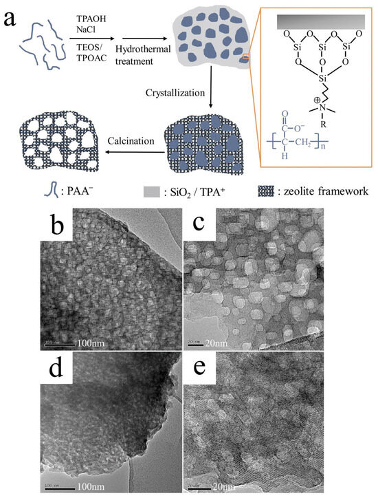 (a) Formation mechanism of mesoporous Silicalite-1; TEM images of mesoporous silicalite-1 synthesized with different salts: (b,c) KCl and (d,e) NaNO3 [77]. Copyright 2020, Elsevier B.V.