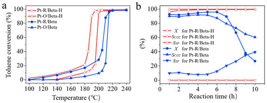 (a) Catalytic combustion of toluene over Pt-R/Beta-H, Pt-O/Beta-H, Pt-R/Beta, and Pt-O/Beta catalysts; (b) Dependences of activities on reaction time in the catalytic combustion of toluene over Pt-R/Beta-H and Pt-R/Beta catalysts [113]. Copyright 2013, Elsevier B.V.