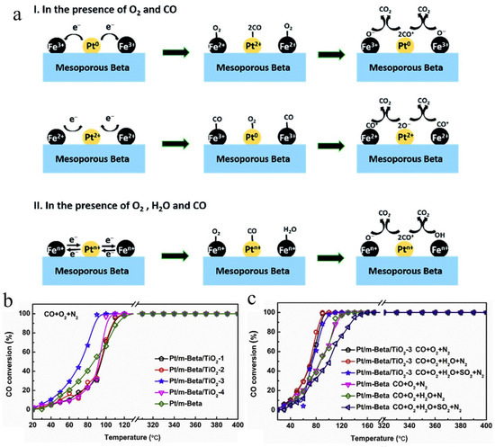 (a) The possible catalytic pathways of CO oxidation over the catalyst Pt/Fe(3)-mBeta under different conditions [123]. Copyright 2019, pubs.rsc.org; (b) CO conversion vs. T profile of different catalyst samples in dry reaction atmosphere; (c) The effect of H2O and SO2 on the catalytic activity (CO conversion vs. T profile) of the Pt/m-Beta@TiO2-3 and Pt/m-Beta samples [124]. Copyright 2013, Elsevier B.V.