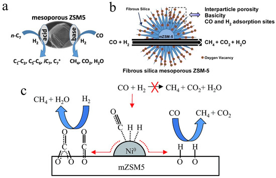 (a) Methanation of CO on mesoporous ZSM5 [125]. Copyright 2015, Elsevier B.V.; (b) Methanation of CO on core–shell structure mesoporous ZSM-5 [126]. Copyright 2016, Elsevier B.V.; (c) Reaction mechanism of CO methanation over Ni/mZSM5 [127]. Copyright 2015, pubs.rsc.org.