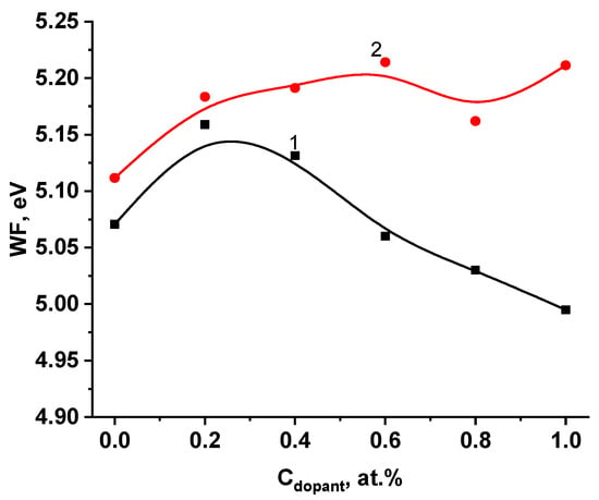 Figure 1 demonstrates the dependencies of the electrode work functions on the dopant concentration for the Nb-doped (curve 1) and Sc-doped (curve 2) sets of the samples.