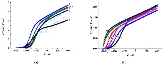 Mott–Schottky plot for the sets of Nb-doped (a) and Sc-doped (b) TiO2 electrodes with the dopant content: 1—0.0 at.%, 2—0.2 at.%, 3—0.4 at.%, 4—0.6 at.%, 5—0.8 at.%, 6—1.0 at.%.