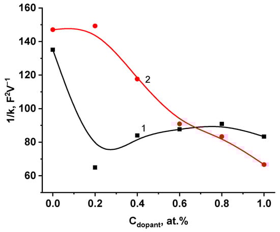 According to the data presented in Figure 2 (the slopes of the curves), all electrode samples demonstrate n-type conductivity, regardless of the type and concentration of dopants. The values of the slopes (k) are proportional to the reciprocal donor concentration (Nd) (Equation (1)). Figure 3 demonstrates the dependencies of the donor state densities on the dopant concentrations.