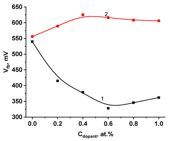 Dependencies of the flat band potentials of the electrodes on the dopant concentrations: 1—Nb, 2—Sc.