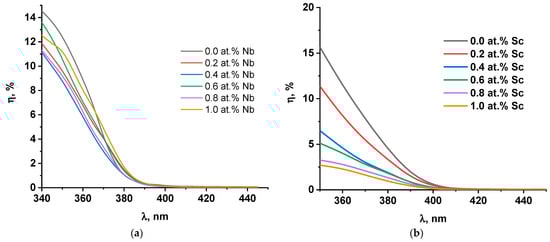 Spectral dependencies of PCCE parameter for Nb (a) and Sc (b)-doped TiO2 electrodes.