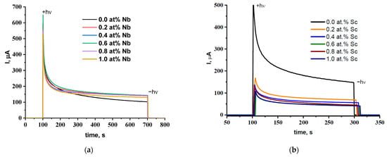 Figure 6 demonstrates the time evolution of photocurrent for Nb and Sc-doped sets of TiO2 electrodes.