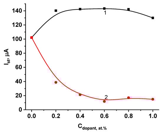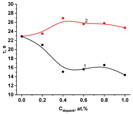 All time dependencies of photocurrent demonstrate maximal values at the initial moment of irradiation, followed by exponential decay approaching the stationary values of the photocurrent. The dependencies of the stationary values of photocurrent and decay time on the dopant content are presented in Figure 7 and Figure 8, respectively.