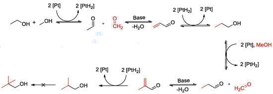 Reaction pathway for the synthesis of iso-butanol from ethanol and methanol [].