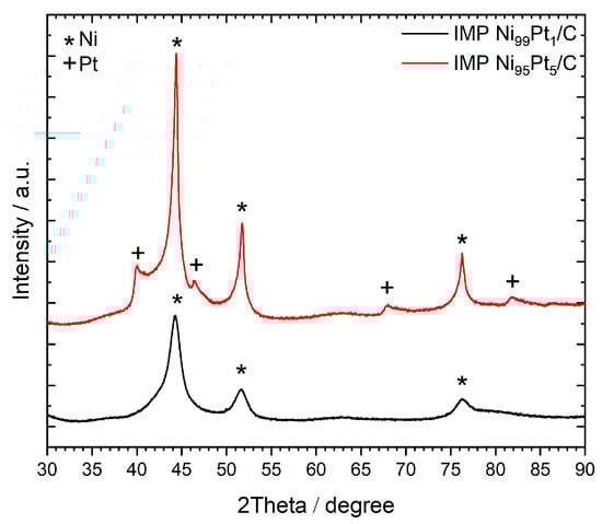 Figure 2 presents the XRD patterns of the IMP Ni99Pt1/C and IMP Ni95Pt5/C catalysts, respectively, that were prepared via the above-described impregnation method. All XRD recordings from this figure show reflections between 2Θ = 20° and 30°, and at 80°. These reflections have already been observed in previous measurements of various carbon-supported catalysts []. They represent the peaks of the amorphous activated carbon support itself.