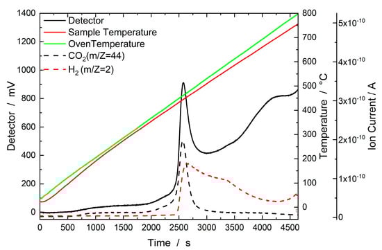 Figure 3 presents the results of an H2–TPD experiment with the IMP Ni95Pt5/C catalyst. The sample was heated in a stream of Ar from 35 °C to 800 °C, where it was held for one hour. The corresponding thermal conductivity detector (TCD) signal is plotted on the left Y-axis, whereas the mass spectrometer signals for H2 and CO2 can be seen on the right Y-axis. Figure 3 shows a significant increase in the TCD signal normalized to the sample weight between 400 °C and 500 °C. When looking at the signals measured using a mass spectrometer, this increase was due to the desorption of substances with the m/Z values of 2 for H2 and 44 for CO2. CO2 achieved the highest signal intensity. The H2 peak extends over the entire temperature range between 450 °C and 800 °C and reaches its maximum signal intensity at around 470 °C. The occurrence of the signal between 400 °C and 500 °C is explained by H2 spillover from Pt to the activated carbon support at around 350 °C. In this spillover process, the H2 on the Pt surface is dissociated by carboxyl and lactate groups and migrates to the surface of the activated carbon support. There, it is more strongly bound, which is why the peak only occurs at higher temperatures [,]. Very similar behavior during H2–TPD was observed with the IMP Ni99Pt1 catalyst.