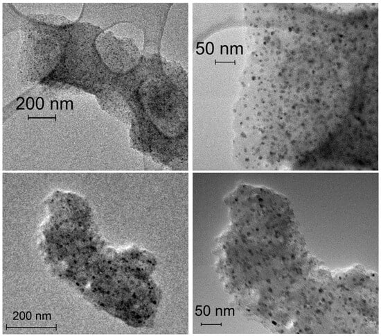 Figure 4 shows the TEM images of the impregnated IMP Ni99Pt1/C (above) and IMP Ni95Pt5/C (below) catalysts at different magnifications. In both cases, the carbon particles shown are evenly coated with metal nanoparticles. There are no local clusters. The particles are separate from each other and primarily round. The largest particles have a diameter of approximately 10 nm, whereas the value for the smallest particles is a few nanometers.
