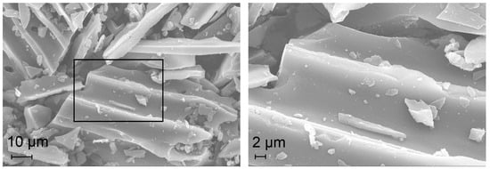 Figure 5 depicts the SEM images of the impregnated IMP Ni99Pt1/C (above) and IMP Ni95Pt5/C (below) catalysts at different magnifications. The largest activated carbon particles have dimensions of 80 × 60 µm. They are elongated and T-shaped with partition walls 10 µm apart. The partition walls are 2 µm wide. No pore structures are visible. The particles have a smooth surface and an irregular edge structure. The EDX analysis demonstrated an even signal intensity for both the Ni and Pt metals over the entire activated carbon particle.