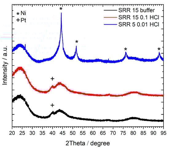 Figure 6 depicts the XRD patterns of the three SRR 15 buffer, SRR 15 0.1 HCL, and SRR 5 0.01 HCl samples, each of them representing the synthesis via the three different polar solutions. In the case of the SRR 5 0.01 HCl catalyst, sharp reflections at 2Θ = 45°, 52°, 76°, and 94° can be observed, indicating crystalline Ni phases, while, in parallel, no Pt signal was found for this sample. As Table 4 shows high values for the Ni weight loading on the surface of 7.33% in comparison to 0.24% for Pt, it is assumed that the supposable Pt reflections at 2Θ = 40° and 46° are superimposed by the described signals for Ni. For the SRR 15 buffer and SRR 15 0.1 HCl catalysts, which both have very small quantities of Ni weight loading on their surfaces (0.32% and 0.10%, respectively), no Ni reflections were observed. However, small Pt signals were found at 2Θ = 40°. It can be concluded from this figure that the metal loadings on the SRR 15 buffer and SRR 15 0.1 HCl catalysts were too small to give signals at significant intensities.
