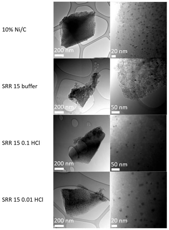 TEM images of the Ni/C catalyst and of the three samples, SRR 15 buffer, SRR 15 0.1 HCL, and SRR 5 0.01 HCl, with the scales being in the range of 20–200 nm.