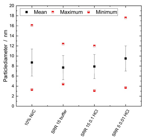 Both TEM images of the SRR 5 0.01 HCl catalyst display many stochastically distributed nanoparticles. The number of nanoparticles of 150 corresponds to that of the Ni/C catalyst, whereas the other two SRR variations had significantly fewer nanoparticles. The nanoparticles had an average particle diameter of 9.5 nm. The exact size distributions are displayed in the boxplot diagram in Figure 8, which shows the maximum, minimum, and mean values determined using the TEM measurements for the four different catalysts. Overall, the nanoparticle sizes of the SRR 5 0.01 HCl catalyst were the largest, with an average diameter of 9.5 nm, whereas those of the catalyst with a stirring time of 15 min in the KCl/HCl buffer solution were the smallest at 7.7 nm.