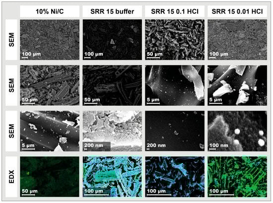 SEM and EDX images of the Ni/C catalyst and of the three samples, SRR 15 buffer, SRR 15 0.1 HCL, and SRR 5 0.01 HCl; the magnifications are between 200 and almost 250,000. In the EDX measurements, Ni is shown in green and Pt in blue.