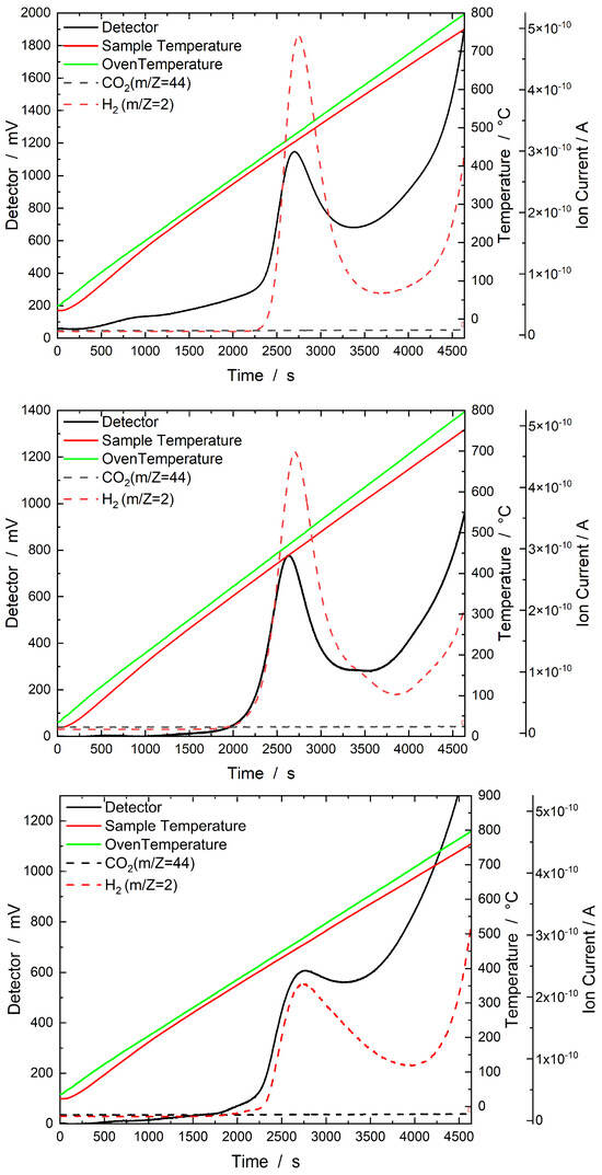 Results of the H2–TPD experiment with the three samples, SRR 15 buffer (top), SRR 15 0.1 HCl (middle), and SRR 5 0.01 HCl (bottom). The samples were heated in a stream of Ar (30 mL min−1) from 35 °C to 800 °C, which was then held for one hour. The corresponding thermal conductivity detector signal is plotted on the left Y-axis, the sample and oven temperatures on the first right Y-axis, and the mass spectrometer signals (ion currents) on the second right Y-axis.