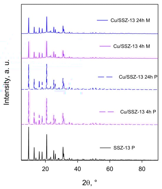 XRD patterns of pure SSZ-13 (black pattern) and Cu-exchanged powder catalysts as well as composite 3D monoliths with 60% SSZ-13 in the silica–laponite matrix.