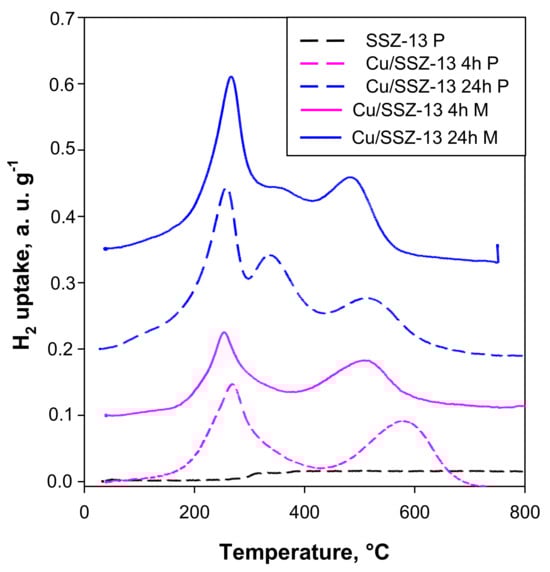 The presence of two well-defined peaks suggests that there are two main different copper species or that a single copper species is reduced into two steps. However, there is a general agreement in the literature regarding the presence of at least two types of copper species in the SSZ-13 framework; the different areas of the two signals are in contrast with a two step reduction of a Cu2+ species (from Cu2+ to Cu+ and from Cu+ to Cu0) []; however, they should correspond to copper located at different sites. The less easily reducible one, requiring higher temperatures, is located in the 6-MRs, whereas the more reducible copper species is located in the larger 8-MR-sized windows of the chabazite cages [,].