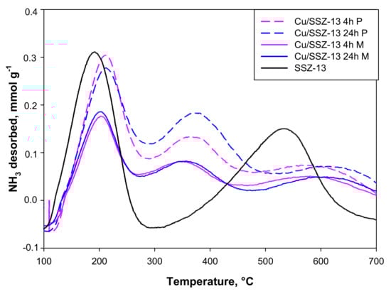 Fan et al. [] found, for fresh Cu/SSZ-13, a main low-temperature desorption peak located at 190 °C and two small desorption peaks at 320 °C and 400 °C. They associated the low-temperature peak to the weakly bound NH3 desorbed from Lewis acid sites, whilst the desorption peaks at 320 °C and 400 °C were attributed to the NH3 adsorbed on strong Lewis acid sites, created by the isolated Cu2+ ions and strongly bound NH3 on Brønsted acid sites, respectively.