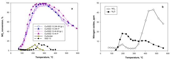 Exchanged monoliths were tested under conditions described in §3.3, achieving 100% NO conversion from about 150 to 400 °C. However, due to the significantly higher amount of zeolite in the reactor when using monoliths and to some flow limitations of the lab-scale rig, it was not possible to directly compare composite 3D monoliths and their corresponding pure zeolite catalysts at the same gas hourly space velocity. Therefore, 3D monoliths were grounded, and SCR tests were repeated using the same weight and particles size as for the corresponding samples of the pure Cu-SSZ-13 catalyst. In Figure 8, the NOx conversion as function of the reaction temperature is reported for both the pure zeolites ion-exchanged for 4 and 24 h and their corresponding composite samples derived from monoliths. A blank run over the SSZ-13 powder confirmed a negligible contribution of the pristine zeolite and the key role of the metal active sites. On the other hand, the very low NOx conversion of the Cu-exchanged binder without zeolite confirmed the active role of copper exchanged into zeolite positions. Roughly 100% NOx conversion was achieved over all the Cu-exchanged SSZ-13 samples (both as pure and in combination with the binder) in the 200–300 °C temperature range, which is in good agreement with the average NOx conversion reported by others for Cu-SSZ-13 catalysts in the same range of temperature [,,]. The pure zeolite sample exchanged for only 4 h provided slightly better performance when compared to its counterpart exchanged for 24 h, despite its lower copper load. The decline of NOx conversion for temperature beyond ca 320 °C was mostly associated with the direct NO oxidation to NO2 (shown in Figure 8b for Cu/SSZ-13 P 24 h). On the other hand, N2O production remained below 20 ppm and progressively decreased above 200 °C. It was verified by independent NO adsorption tests under NO/O2 mixture at 100 °C followed by heating under inert flow that the emission of NO2 at 300–400 °C occurred by direct NO oxidation. In other words, the Cu/zeolite is able to oxidize pre-adsorbed NO at high temperatures; however, in the presence of NH3, this unwanted side reaction is limited by the prevailing of the SCR reaction.