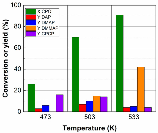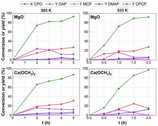 Figure 3 shows the use of MgO as the catalyst at 503 K and 533 K. In both cases, the CPCP yield at a shorter reaction time is higher than the DAP yield. While the CPCP yield goes up to 24% at 503 K before further reacting, with the increase in temperature (533 K), this maximum yield is only 16%. Regarding the behavior of Ca(OCH3)2 catalysts, the difference between the CPCP yield is not so easily appreciated. While the maximum at 503 K is 16%, at 533 K, it is 12% (see Figure 3). This finding shows a lower selectivity for route c at higher temperatures. Nonetheless, the maximum DAP yield in all cases is approximately 30%, which could be due to the competitive nature of the aldol condensation reaction. The self-aldol condensation of CPO has proven to be one of the main challenges of this reaction regardless of the temperature. While the selectivity for CPCP is higher than that for DAP at shorter reaction times, a decrease in the yield of CPCP has been observed as the reaction time increases, possibly due to its ability to continue to react with more CPO to form oligomers [30].