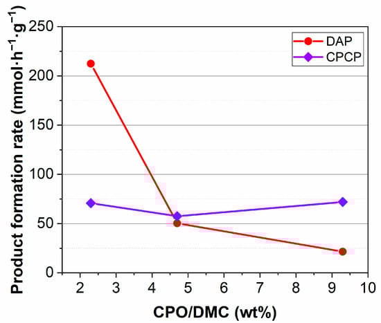 An approach to obtain a higher selectivity for DAP by eliminating the self-aldol condensation reaction is to use lower concentrations of CPO. Therefore, the CPO concentration was decreased, while the amount of catalyst, MgCO3 (HC), was kept unchanged. In this case, the most appropriate way is to represent the formation rate of the main products, such as DAP and CPCP, against the concentration of CPO, which is shown in Figure 4 for 1 h of reaction.