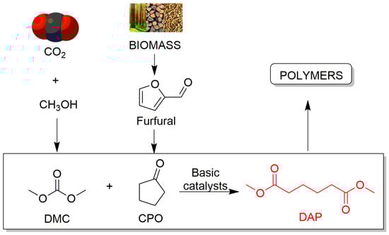 Adipic acid (AdA) is an essential building block used to manufacture nylon 6-6, adipic esters and polyurethanes. Among its many applications, its uses in the pharmaceutical, cosmetic and food industries stand out [1,2]. Currently, adipic acid is mainly produced from petroleum-based feedstock. Benzene is hydrogenated to cyclohexane and further treated to synthesize ketone/alcohol oil (KA-oil), a mixture of cyclohexanone and cyclohexanol, which is oxidized with nitric acid to obtain AdA [3]. Given that this process is not sustainable due to its several steps and the nitrous emissions produced [4], a number of greener routes have been proposed over the last decade [5,6]. Lignocellulose biomass, made up of cellulose, hemicellulose and lignin, presents itself as a renewable carbon source, from which the conversion to valuable chemical products has attracted interest over the last years [7,8,9]. Among the processes to obtain AdA from biomass, an attractive process is the synthesis of dimethyl adipate (DAP) from cyclopentanone (CPO) and dimethyl carbonate (DMC). CPO is an interesting compound used in the synthesis of fungicides, pharmaceuticals, flavors, fragrances and rubber chemicals. Currently, it is obtained through petrochemical routes [10,11]; however, recently, its synthesis from biomass has been thoroughly studied via the hydrogenation of furfural [12,13,14,15]. DMC is an attractive solvent and reactant due to its chemical properties and low toxicity. It is used in methylation and carboxymethylation reactions as an eco-friendly substitute to phosgene, dimethylsulfate and metal halides [16,17]. Furthermore, its origin is also green, since it can be obtained from the reaction between CO2 and CH3OH [18]. Given that CO2 is one of the compounds responsible for the greenhouse effect, its capture and use in the synthesis of carbonates is highly interesting. By choosing the DAP synthesis from CPO and DMC, we combine biomass and CO2 to synthesize biopolymers (Scheme 1).