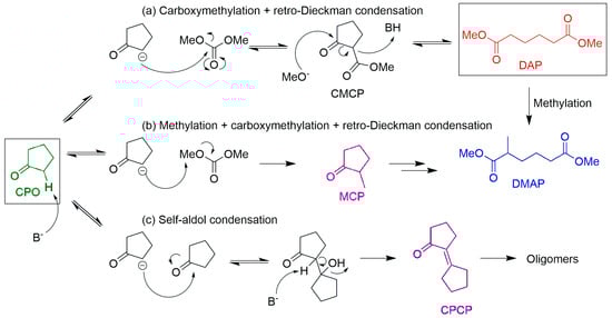 Regarding the reaction mechanism, DMC facilitates both methylation and carboxymethylation reactions, as mentioned above. Therefore, the methylation of reagents, intermediates and products can represent a competitive route of the selective pathway towards DAP. Scheme 2 shows a plausible mechanism. The basic catalyst abstracts a proton from the CPO, forming an enolate that attacks the carbonyl group of DMC, possibly obtaining the intermediate 2-carbomethoxy-cyclopentanone (CMCP). Later, the previously leaving methoxide anion attacks CMCP, giving DAP (route a). The desired product can be further methylated in the reaction media to synthesize dimethyl 2-methyladipate (DMAP). This compound can also come from the carboxymethylation of 2-methyl cyclopentanone (MCP), which is obtained by CPO methylation (route b). Furthermore, the self-aldol condensation of CPO can occur, giving 2-cyclopentylidene-cyclopentanone (CPCP) (route c).