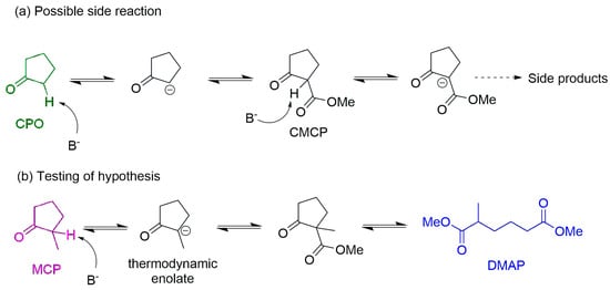 The selective pathway describes the synthesis of our target monomer DAP, where CMCP (Scheme 2) is possibly the intermediate compound in this route. This intermediate is highly reactive because of its acid proton located between the two carbonyl groups (Scheme 3a). It is possible that, instead of following the selective route, the base catalyst abstracts this proton, synthesizing a different active intermediate that could end up giving other unidentified products at the expense of the DAP yield (Scheme 3a). To evaluate this hypothesis, a reaction using MCP as the substrate instead of CPO and MgCO3 (HC) as the catalyst was conducted. In this case, due to the methyl group of the substrate, two possible enolates can be formed once the MCP is deprotonated: the kinetic and thermodynamic enolate. Given the use of high temperatures and low amounts of catalyst, the thermodynamic enolate is favored (Scheme 3b) [27,28,29]. This means that the produced intermediate lacks that acid proton found in CMCP. Since this proton is absent, this intermediate can only synthesize DMAP through a ring-opening reaction (Scheme 3b). If the acid proton in CMCP was responsible for the low DAP yields, in this second reaction (Scheme 3b), the DMAP yield would be higher. However, the DMAP yield was 30%, comparable with the 29% of DAP obtained using CPO as the substrate (Table 1, entries 1 and 2). Consequently, the consumption of the intermediate CMCP to form new compounds other than DAP can be ruled out as a source of DAP selectivity loss.