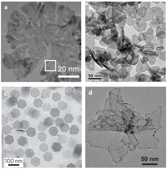 TEM images of (a) ultrathin PdAg nanoplates. Reprinted from [35] with Permission from WILEY, 2023, (b) ultrathin Pt NSs. Reprinted from [36] with Permission from RSC, 2018, (c) freestanding ultrathin Pd NSs. Reprinted from [37] with Permission from Springer Nature, 2018, and (d) PdCu alloy NSs. Reprinted from [38] with Permission from WILEY, 2017.