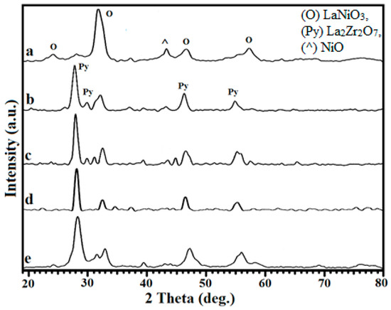 XRD patterns of LaNixZr1−xO3 catalysts synthesized by sol–gel method: (a) x = 0.8, (b) x = 0.6, (c) x = 0.4, (d) x = 0.3, and (e) x = 0.2.
