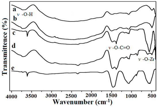 FT-IR patterns of LaNixZr1−xO3 catalysts synthesized by sol–gel method: (a) x = 0.8, (b) x = 0.6, (c) x = 0.4, (d) x = 0.3, and (e) x = 0.2.