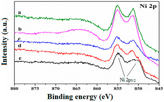Ni 2p core-level spectra of LaNixZr1−xO3 catalysts synthesized by sol–gel method: (a) x = 0.8, (b) x = 0.6, (c) x = 0.4, (d) x = 0.3, and (e) x = 0.2.