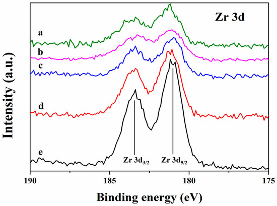 Figure 4 shows the Zr 3d XP spectra of the LaNixZr1−xO3 catalysts synthesized by the sol–gel method. In the present study, the bands corresponding to Zr4+ in zirconium oxide appearing at 181.3 and 183.7 eV are attributed to Zr 3d5/2 and Zr 3d3/2, respectively [31,32]. However, in low-Ni-containing catalysts, the binding energy values recorded are a little lower, indicating that the Zr is in a lower oxidation state due to the structural defects arising from the strong interaction with other metals. With the increase in Ni content in the catalysts, the binding energy bands shifted to a higher value, indicating that the Zr is stabilized in ZrO2. In the Zr 3d XP spectra reported by Xu et al. [29], the peaks corresponding to binding energies of 181.3 and 183.7 eV were of Zr 3d5/2 and Zr 3d3/2, respectively, with the splitting of binding energies being 2.4 eV. This photoemission feature is well corroborated with the previous literature [29].
