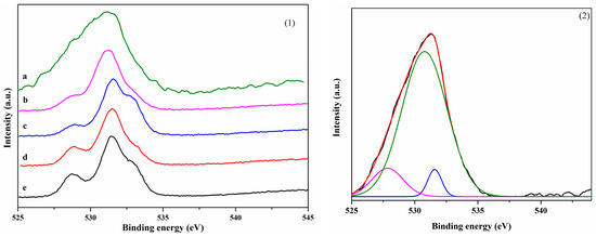 (1) O 1 s core-level spectra of LaNixZr1−xO3 catalysts synthesized by sol–gel method: (a) x = 0.8, (b) x = 0.6, (c) x = 0.4, (d) x = 0.3, and (e) x = 0.2; (2) deconvoluted O 1 s XPS of LaNi0.8Zr0.2O3 catalyst.