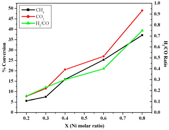 The DRM reaction was conducted over the synthesized LaNixZr1−xO3 catalysts using the feed in the ratio of CH4:CO2:N2 = 80:80:80 and a total gas flow rate of 240 mL/min in a fixed-bed reactor. Figure 6 shows the activity profiles of LaNixZr1−xO3 oxide catalysts observed at 800 °C. The conversion of both methane and carbon dioxide progressively increased with an increase in the Ni content in the catalysts and attained their maximum values with catalysts having an x value of 0.8. The reducibility of the catalysts increased with the increase in Ni content. The catalytic activity also followed the same trend. As the Ni ratio increased, the formation of dispersed Ni with La–Zr support increased, leading to enhanced activity. On the other hand, catalysts with a lower Ni ratio (x = 0.2–0.4) showed a greater interaction with the support, lowering the reducibility. Among the series, x = 0.8 catalysts showed the highest activity with a 50% CO2 conversion and 37% CH4 conversion along with a syngas ratio of 0.76. This trend of a higher conversion of CO2 over methane was also identified by other researchers [28,35]. Bachiller-Baeza et al. [35] observed that the DRM reaction is always accompanied by side reactions like the reverse water–gas shift reaction (RWGS). This reaction consumes H2 produced in the DRM reaction to form CO, thereby decreasing the syngas ratio.
