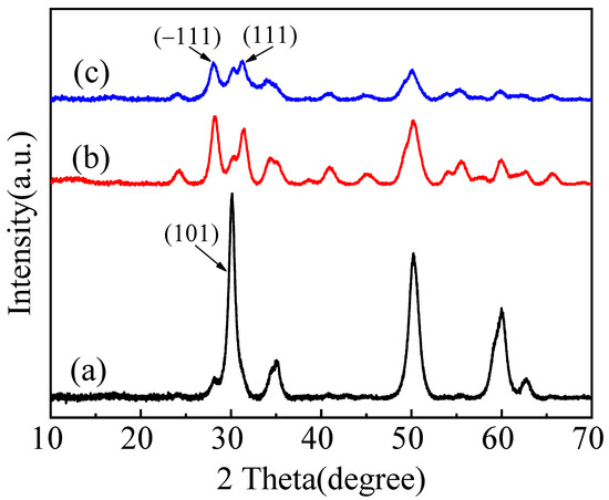 XRD patterns of ZrO2-1 (a), ZrO2-2 (b), and ZrO2-3 (c).