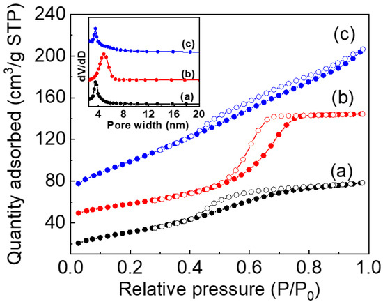 Nitrogen adsorption–desorption isotherms of ZrO2-1 (a), ZrO2-2 (b), and ZrO2-3 (c). The insert shows the pore size distributions.