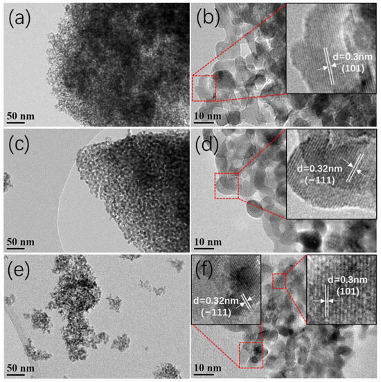 TEM and HRTEM images of ZrO2-1 (a,b), ZrO2-2 (c,d), and ZrO2-3 (e,f).