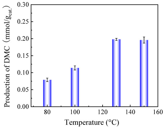 The catalytic performances of zirconia nanocrystals were examined for the direct synthesis of DMC from methanol and CO2. In order to identify the optimal reaction temperature for a high DMC production, different reaction temperatures have been used to evaluate the catalytic activity of the ZrO2-3 catalyst, as shown in Figure 4. DMC production increased dramatically with the reaction temperature to reach 0.2 mmol/gcat. at 130 °C. It decreased slightly when further increasing the reaction temperature. This may be explained by the preferential formation of dimethyl ether (DME) at high reaction temperatures [43]. Therefore, a reaction temperature of 130 °C turned out to be optimal and was kept for the rest of the study.