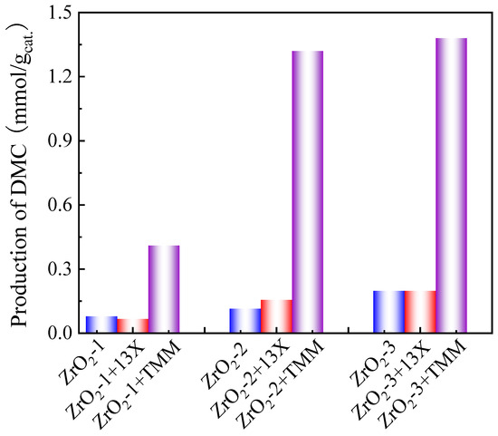 Molecular sieves have been widely reported as inorganic dehydration agents for the formation of DMC from CO2 and methanol due to the advantages of easy operation, no byproduct formation, and recyclability [27,44]. In our study, molecular sieve 13X was tested alone and in combination with TMM, but no DMC was produced. When molecular sieve 13X was combined with zirconia as a catalyst (as shown in Figure 5 red bars), it did not present any promotion of DMC production. However, it did not degrade DMC either. TMM was then tested as a dehydrating agent. It is of particular interest to note that when TMM reacts with water, it forms methanol, which is one of the main reactants. It turned out that TMM is a very efficient dehydrating agent to promote DMC production when combined with all three zirconia catalysts (violet bars), suggesting that TMM has a relatively high reactivity with water. Specifically, for the ZrO2-3 catalyst, the DMC production reaches up to 1.4 mmol/gcat., showing that TMM is a suitable dehydration agent for the synthesis of DMC.