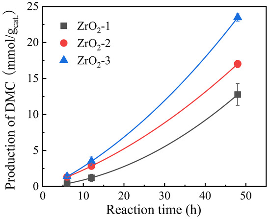 To further increase the DMC production, the effect of reaction time was investigated for the three zirconia catalysts (Figure 6). The DMC production increased remarkably on all three zirconia catalysts, with increasing the reaction time when combined with TMM as a dehydration agent. ZrO2-3 catalyst exhibited a 24 mmol/gcat. DMC production after 48 h of reaction, which is 17 times higher than after 6 h of reaction. The DMC production after 48 h on the ZrO2-3 catalyst is significantly higher than that on the ZrO2-1 and ZrO2-2 catalysts.