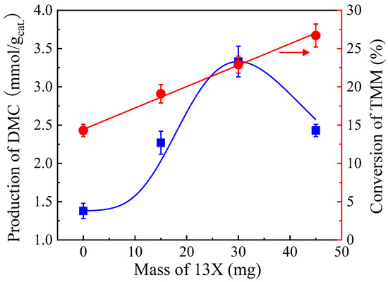 Figure 7 shows that the DMC production improved to a certain extent with increasing the mass of the second catalyst, 13X, on the ZrO2-3 catalyst with TMM as a dehydration agent. A total of 30 mg of the cocatalyst presents the highest catalytic performances after 6 h of reaction. DMC production decreases when more cocatalyst is added, even if the conversion of TMM continues to increase linearly. It is believed that DMC is decomposed by a too large number of acidic sites introduced by supplementary 13X [52]. In our reaction, 30 mg of the second catalyst has been chosen for the rest of the study. It has to be noted that 13X has a dual role, as it can also trap water during the reaction. To the best of our knowledge, the combination of two solid catalysts in the reaction medium to accelerate in situ water elimination and obtain high DMC production has never been reported.